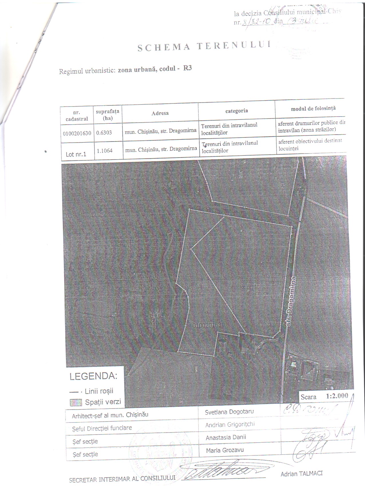 Descrierea Lotul: 4-V Locaţie: mun. Chişinău Sectorul: Buiucani Adresa: str. Dragomirna nr. cadastral: 0100201.1030 Destinație: Construcție locativă (zona R3) Prețul inițial: 8 000 000 lei Suprafața: 1,1064 ha