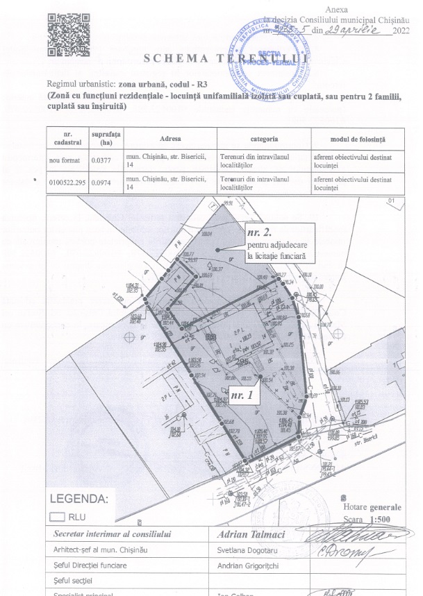 Descrierea Lotul: 12-V Locaţie: mun. Chişinău Sectorul: Buiucani Adresa: str. Bisericii nr. cadastral: 0100522.794 Destinație: Obiect compatibil cu zona R3 Prețul inițial: 500 000 lei Suprafața: 0,0377 ha