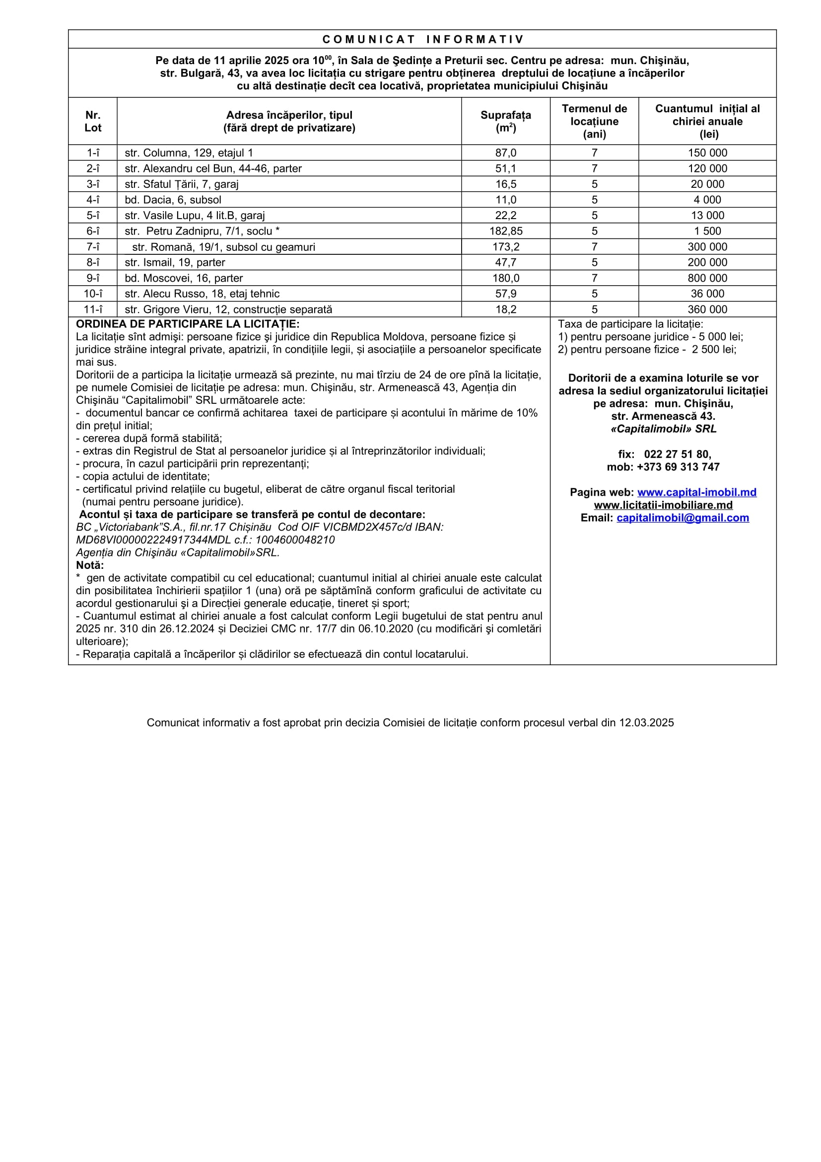 Doritorii de a examina loturile se vor adresa la sediul organizatorului licitației pe adresa: mun. Chişinău,