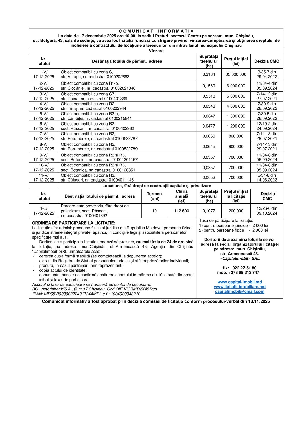 Doritorii de a examina loturile se vor adresa la sediul organizatorului licitației pe adresa: mun. Chişinău,