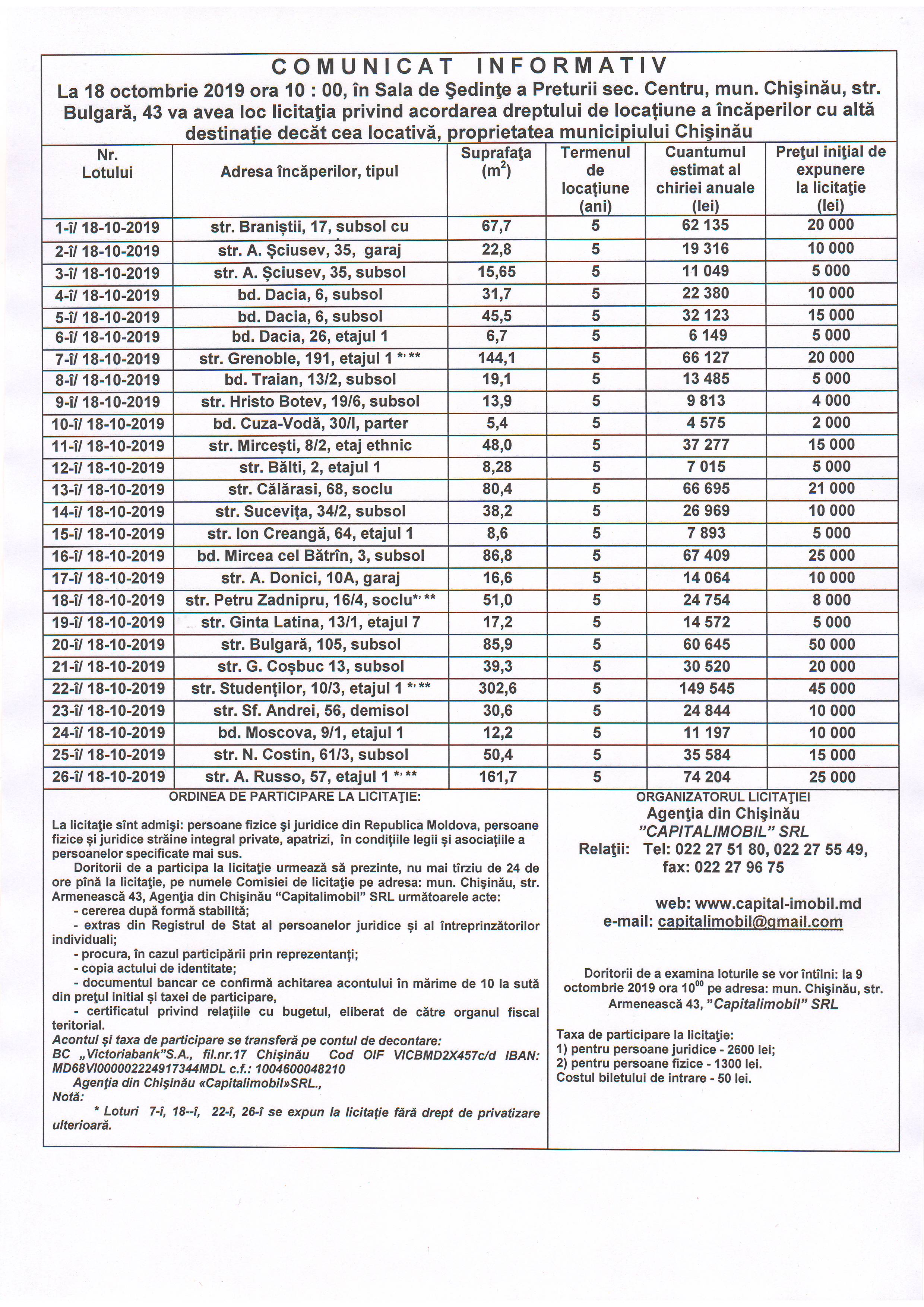 Doritorii de a examina loturile se vor întîlni: la 9 octombrie 2019 ora 1000 pe adresa: mun. Chişinău, str. Armenească 43, ”Capitalimobil” SRL
