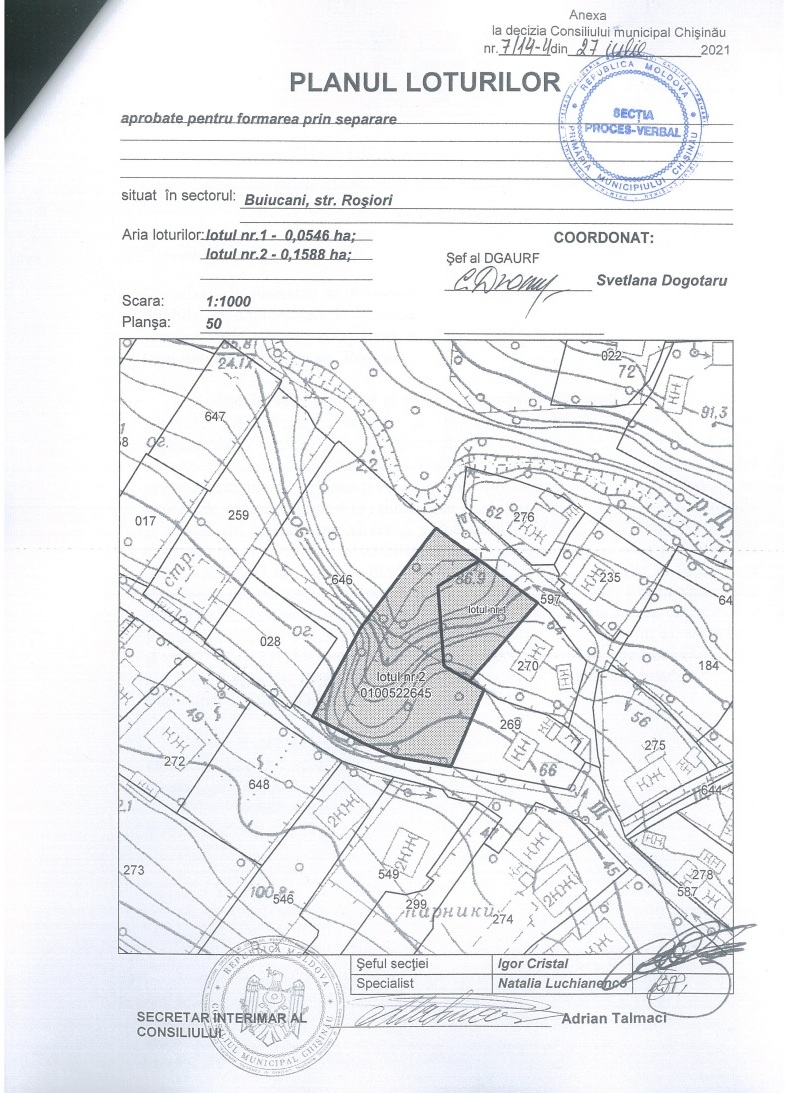 Descrierea Lotul: 1-V Locaţie: mun. Chişinău Sectorul: Buiucani Adresa: str. Roșiori nr. cadastral: 0100522.790 Destinație: Construcție locativ – individuală (zona R2) Prețul inițial: 400 000 lei Suprafața: 0,0546 ha