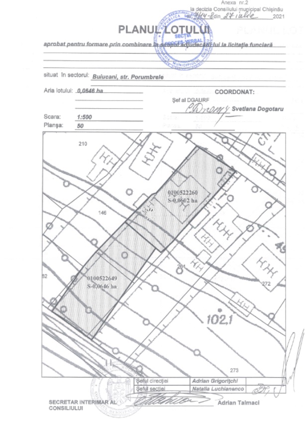 Descrierea Lotul: 2-V Locaţie: mun. Chişinău Sectorul: Buiucani Adresa: str. Roșiori nr. cadastral: 0100522.649 Destinație: Construcție locativ – individuală (zona R3) Prețul inițial: 500 000 lei Suprafața: 0,0646 ha