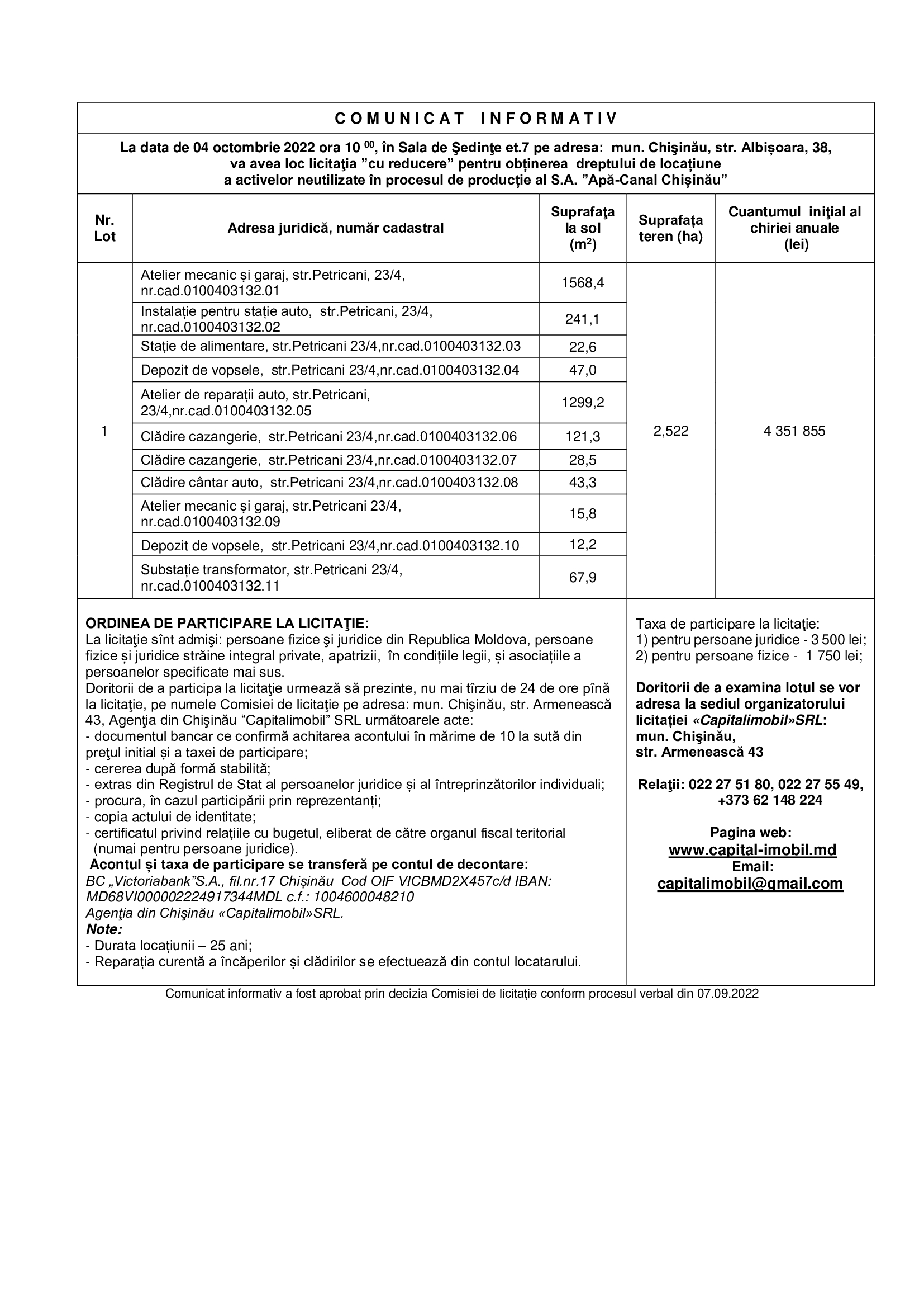 Doritorii de a examina lotul se vor adresa la sediul organizatorului licitației «Capitalimobil»SRL: mun. Chişinău,
