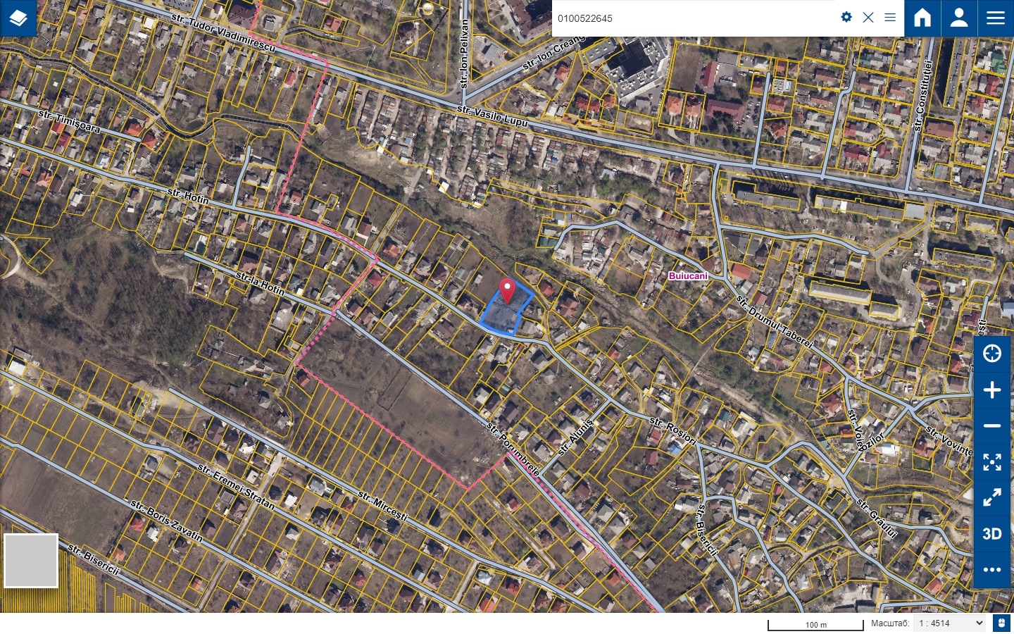 Описание Лот: 4-V Расположение: мун. Кишинёв Район: Буйканы Адрес: ул. Рошиорь кадастровый номер: 0100522.645 частично Назначение: Индивидуальное жилое строение, зона R2 Площадь: 0,0546 Га. Первоначальная цена: 300 000 лей