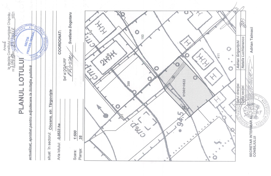 Описание Лот: 8-V Расположение: мун. Кишинёв Район: Чеканы Адрес: ул. Тырговиште кадастровый номер: 0100310.522 частично Назначение: Индивидуальный жилой дом, зона R2 Площадь: 0,0533 Га. Первоначальная цена: 500 000 лей