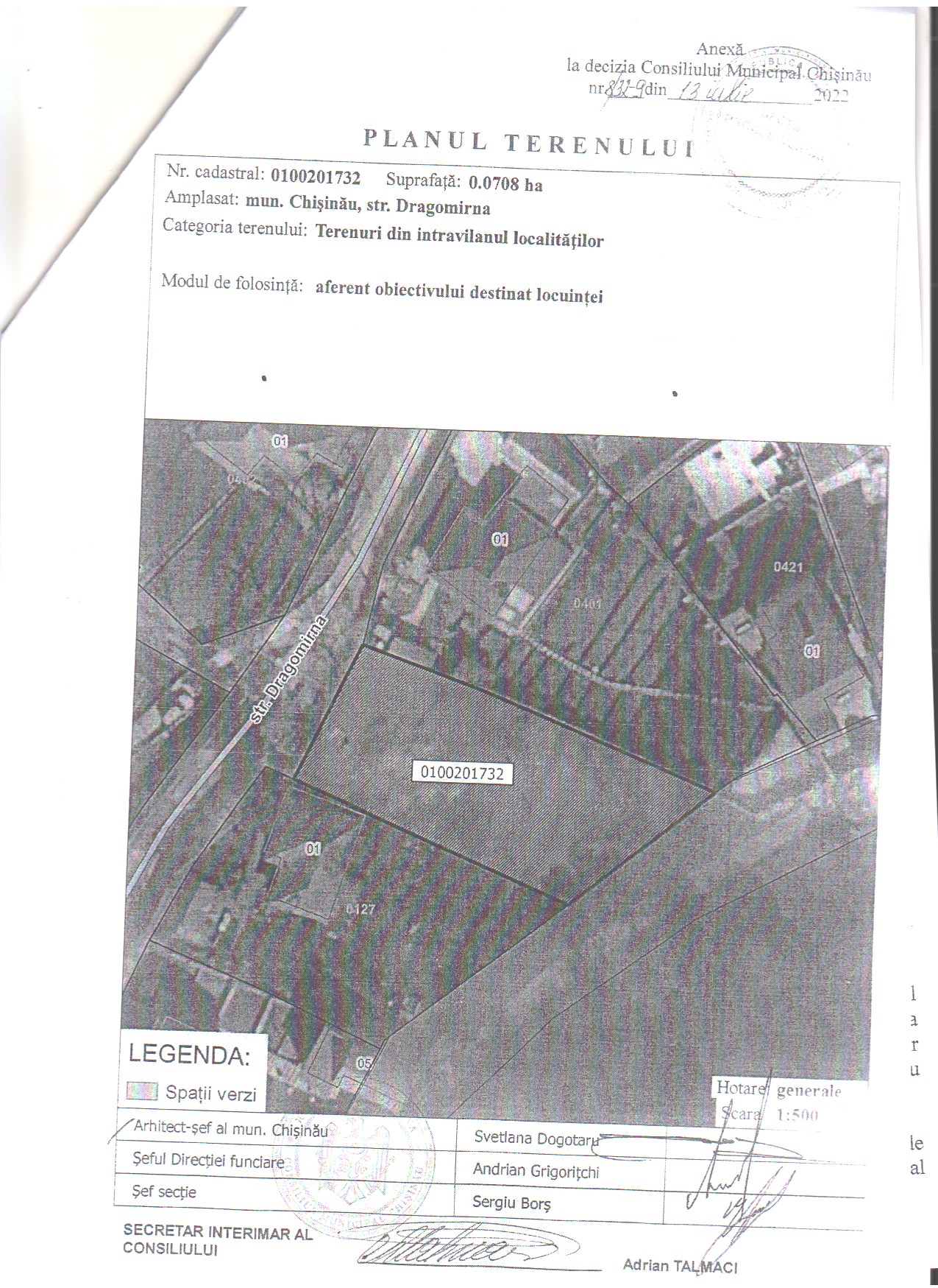 Описание Лот: 4-V Расположение: мун. Кишинёв Район: Буюканы Адрес: ул. Драгомирна кадастровый номер: 0100201.732 Назначение: Объект совместимый с зоной R3 Площадь: 0,0708 Га. Первоначальная цена: 700 000 лей