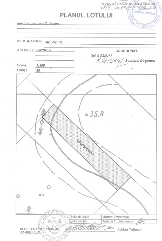 Описание Лот: 8-V Расположение: мун. Кишинёв Район: Чеканы Адрес: ул. Варница кадастровый номер: 0100302.426 Назначение: Объект совместимый с зоной С6 Площадь: 0,0707 Га. Первоначальная цена: 1 000 000 лей