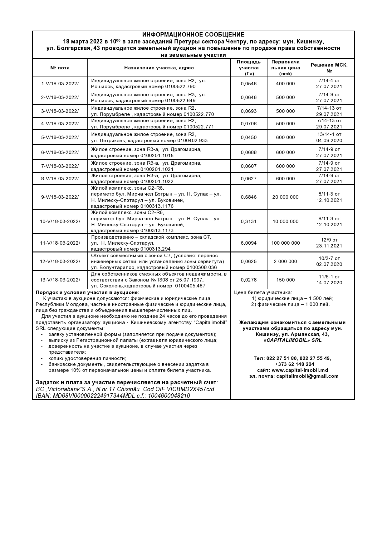 Для участия в аукционе необходимо не позднее 24 часов до его проведения представить организатору аукциона - Кишиневскому агентству “Capitalimobil” SRL следующие документы: