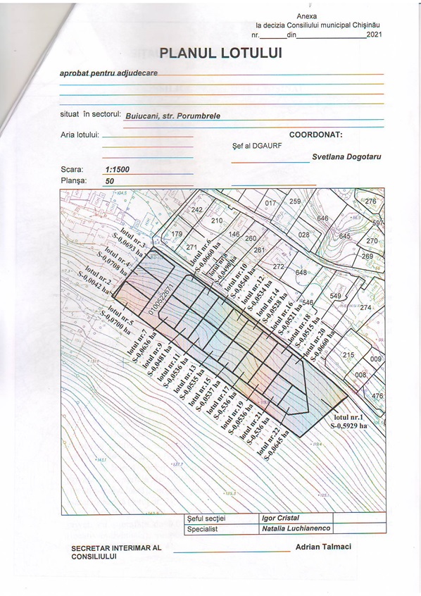Описание Лот: 2-V Расположение: мун. Кишинёв Район: Буйканы Адрес: ул. Порумбреле кадастровый номер: 0100522.781 Назначение: Индивидуальное жилое строение, зона R2 Площадь: 0,0528 Га. Первоначальная цена: 400 000 лей