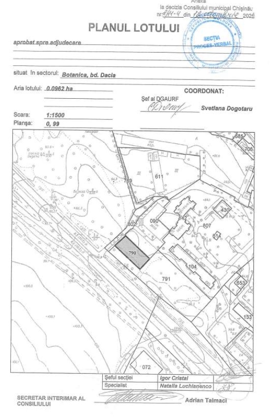 Описание Лот: 13-V Расположение: мун. Кишинёв Район: Ботаника Адрес: бул. Дачия кадастровый номер: 0100120.790 Назначение: Комерческий объект, зона С1 Площадь: 0,0962 Га. Первоначальная цена: 2 500 000 лей