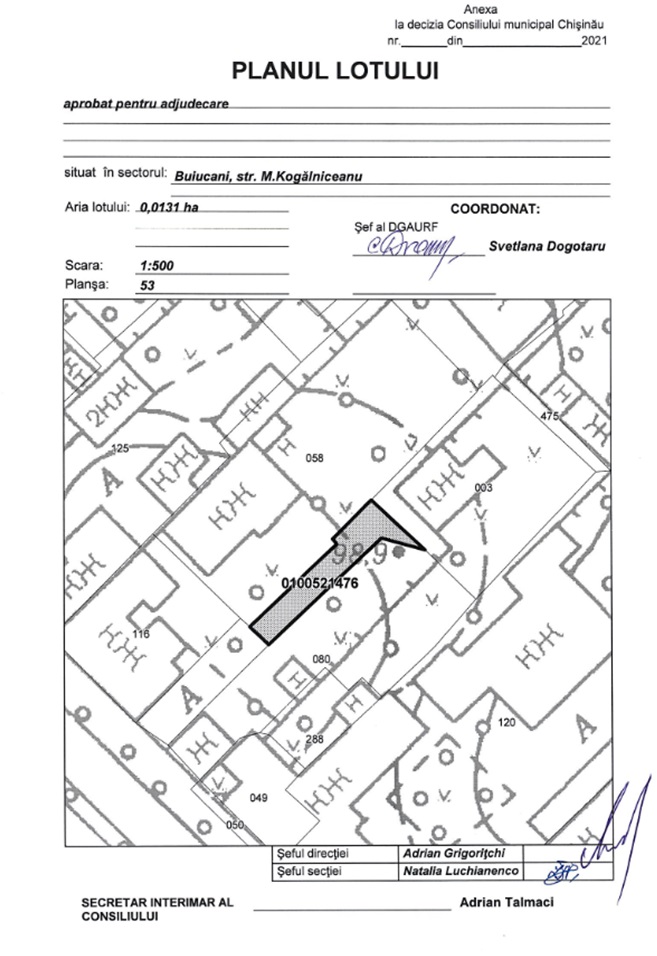 Описание Лот: 11-V Расположение: мун. Кишинёв Район: Бйуканы Адрес: ул. Когэлничану кадастровый номер: 0100521.476 Назначение: Для собственников смежных объектов недвижимости, в соответствии с Законом №1308 от 25.07.1997 Площадь: 0,0131 га. Первоначальная цена: 1 000 000 лей
